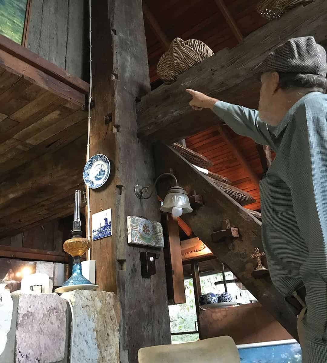 The vertical posts holding the house up were picked up in 1981 as part payment for some landscaping work he did for a client. The 10m long posts (600x300mm) were from the Seafoam Flour Mill in Southbank. The pit-sawn posts were from the late 1800s and the mill was still in operation in the 1940s.