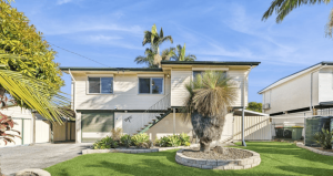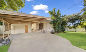 Built in 1975, the estate agent asks for a price of over $745,000. This property has three bedrooms, all fitted with built-in wardrobes, and two bathrooms. Two covered outdoor decking areas across the first and ground floor, a garage, workshop, or work-from-home office space, on top of a carport with room for two car spaces.