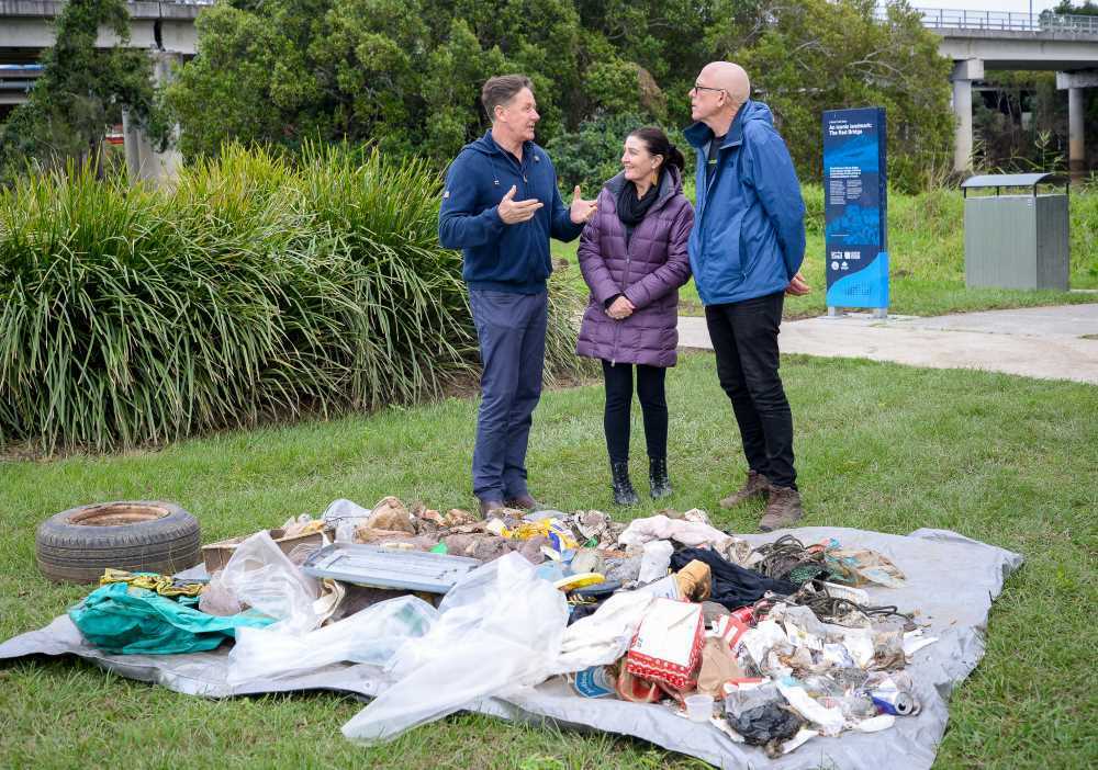Photo: City of Logan Mayor Darren Power, Healthy Land and Water Chief Executive Officer Julie McLellan and Substation 33 founder Tony Sharp inspect rubbish collected from the Logan River.