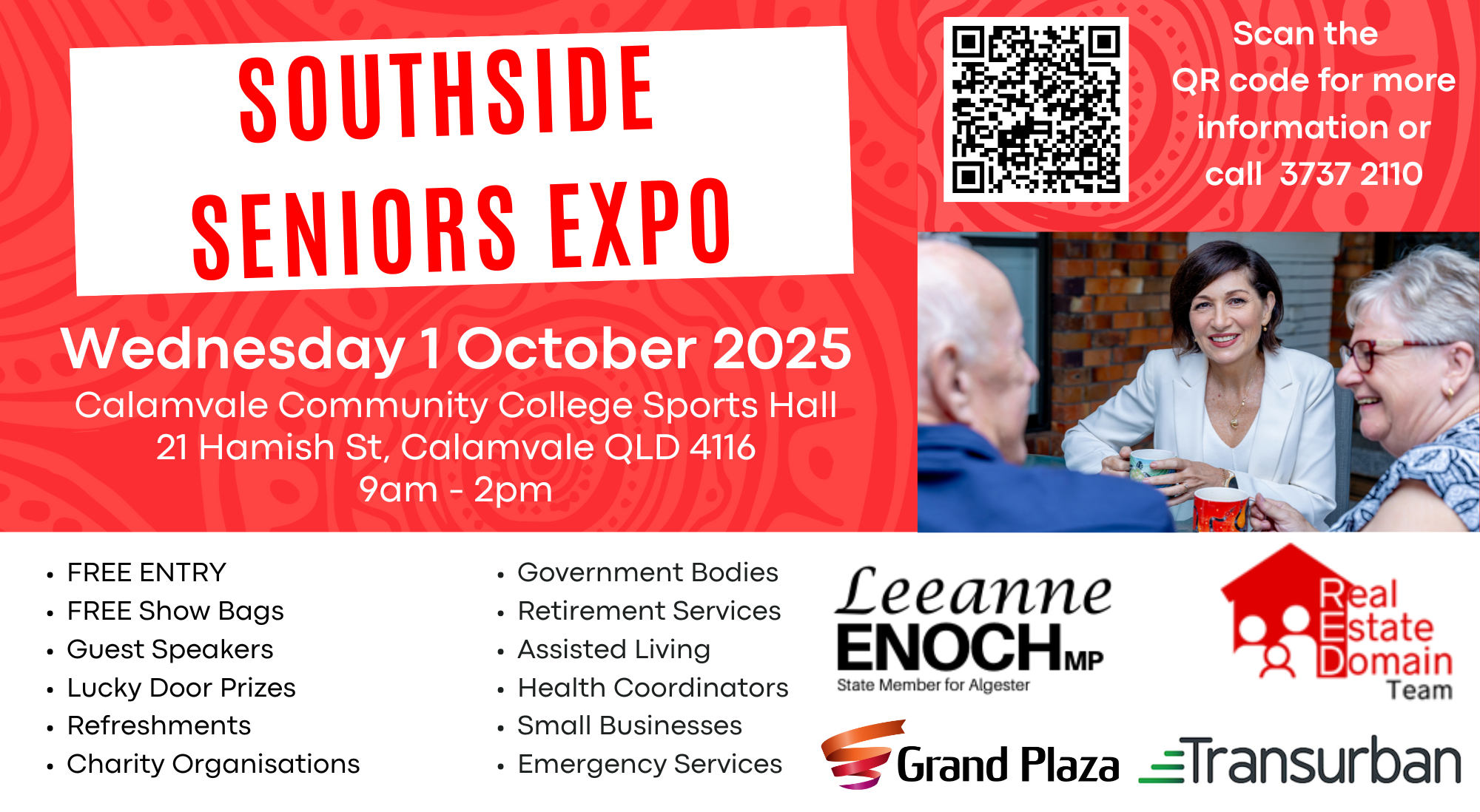 I’m excited to host this free event at Calamvale Community College Sports Hall as part of Seniors Month. It will bring together local services, health and wellness info, lifestyle options, and community groups—all in one place.
