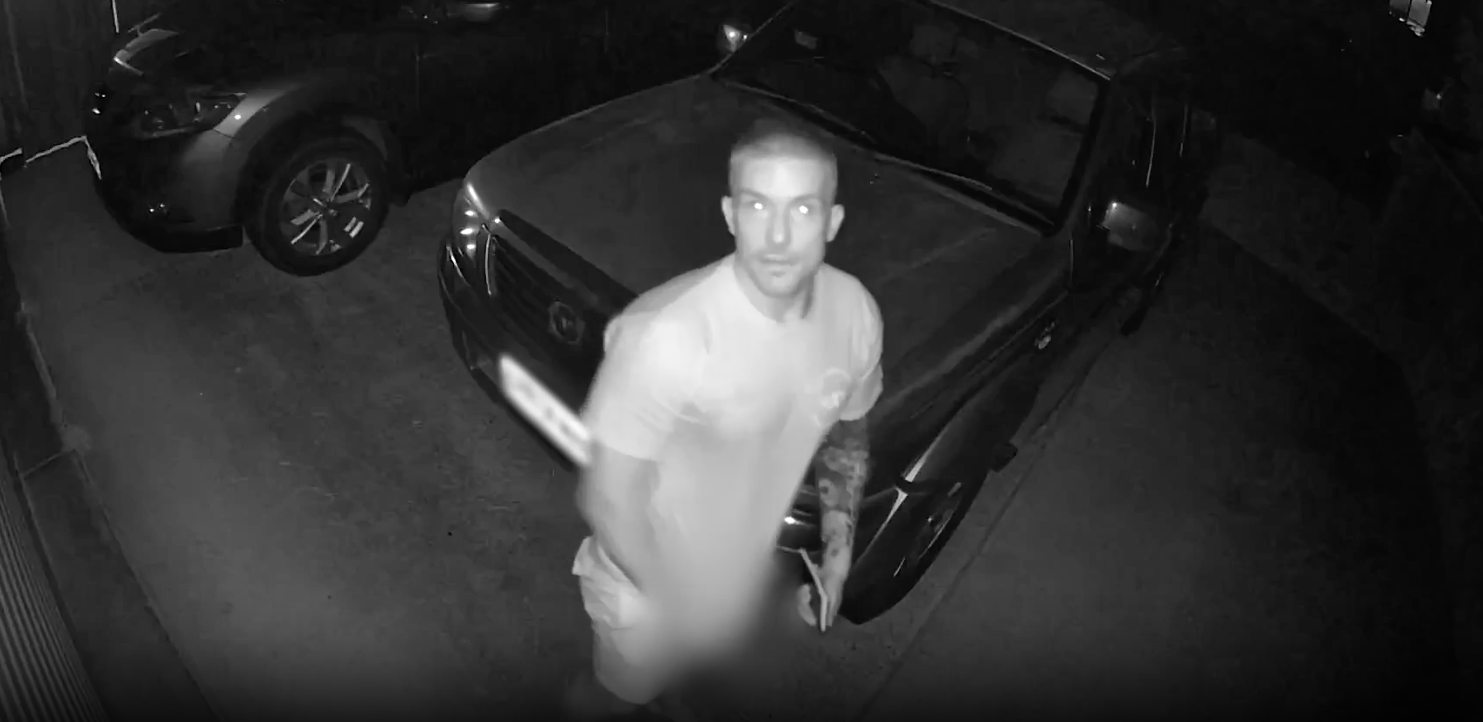 He is described as caucasian, with short hair and aged in his thirties. He also has a sleeve tattoo on his left arm.