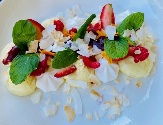 A neatly presented “mess” of meringue, vanilla mascarpone, berries and edible flowers is as nice to look at as it is to eat.