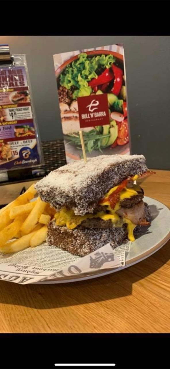 And so it went from there, the creation of the lamington burger – two beef patties, bacon and cheese with mustard and sauce, packed inside two bun-size lamingtons.